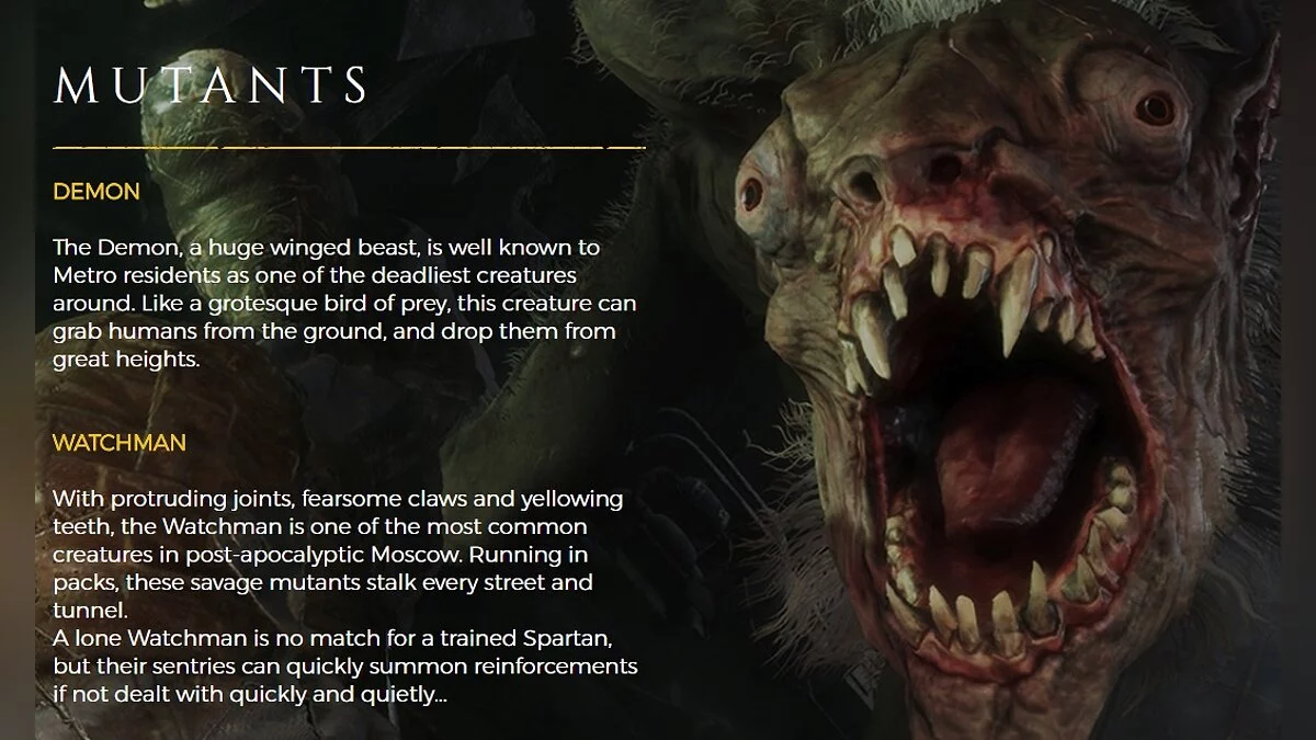 Самыми опасными мутантами будет демон и смотритель. Первый — это большой зверь с крыльями, несущий смертельную опасность. Способен поднять человека и сбросить его с большой высоты. Смотритель — это мутант, который поджидает жертву на каждой улице и в тоннелях. Передвигается быстро и тихо.