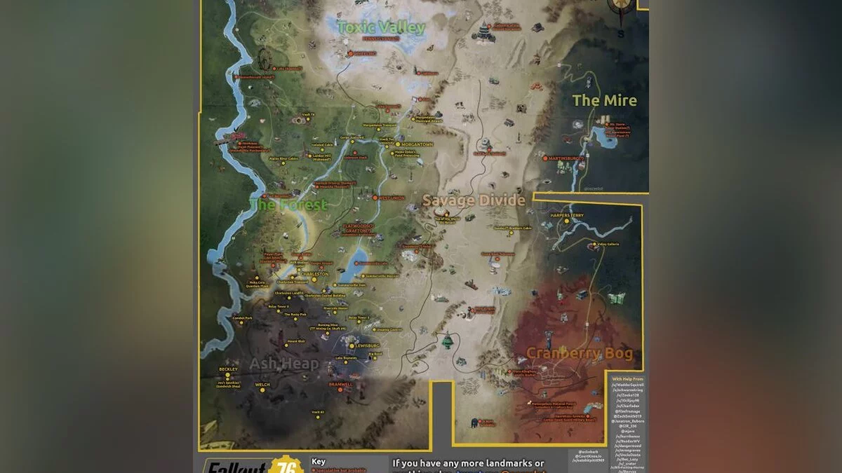 На карту геймеры добавили множество различных объектов, названия поселений, регионов и рек. Карта все еще обновляется, а поэтому со временем на ней могут появиться дополнительные важные объекты, которые, возможно, действительно появятся в финальной версии Fallout 76.