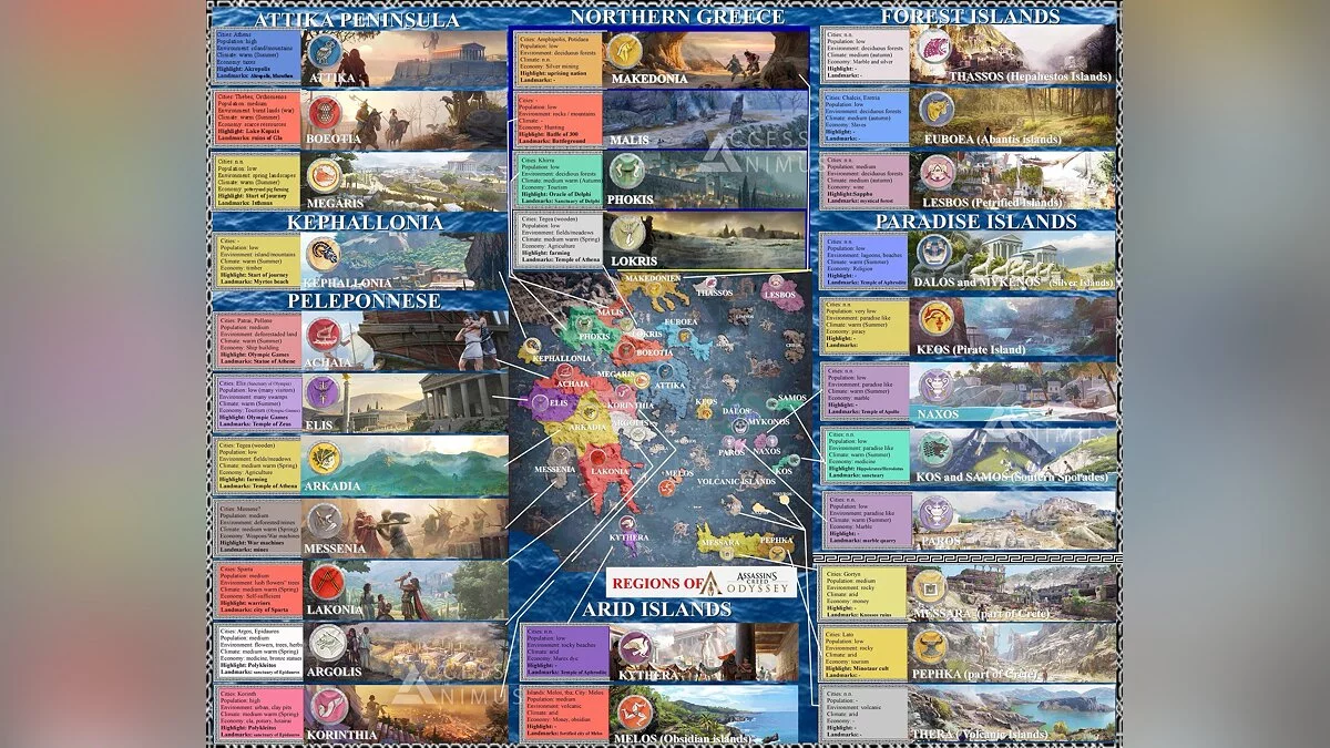Автор собрал воедино всю информацию о регионах, которая опубликована на сайте игры. К слову, в Assassin's Creed Odyssey 28 крупных регионов, а с учетом мелких островов их количество достигает около 40.
