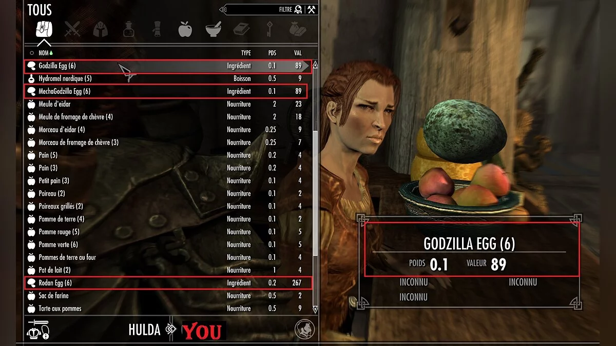 Для вызова Годзилл нужно разместить .esp в самом низу в меню Data Files. После этого появится три книги заклинаний Spell tome, при помощи которых можно призвать монстров. Книги можно получить у персонажа по имени Фаренгар Тайный Огонь, который находится в Вайтране.