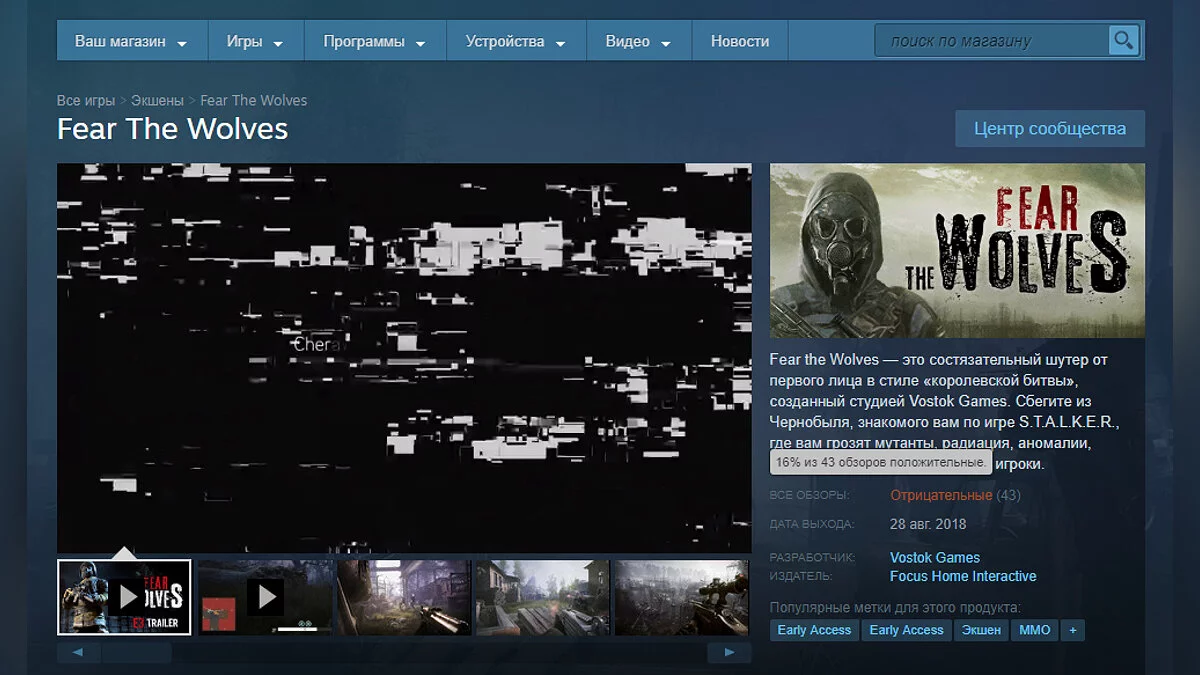 В раннем доступе Steam вышла королевская битва в постапокалиптическом сеттинге Fear The Wolves. Стоит заметить, что на момент написания у игры всего 16 % положительных отзывов от геймеров.