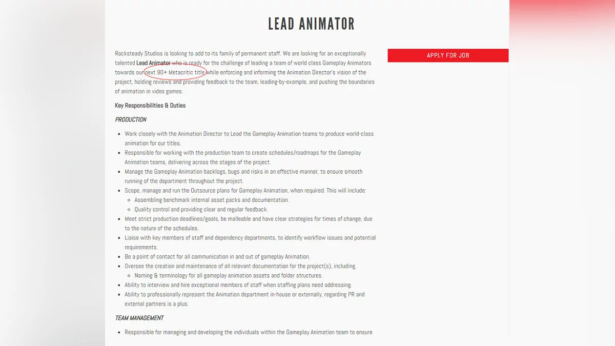Во всех описаниях к новым профессиям команда указала на то, что сейчас ведется работа над «очень ожидаемой ААА-игрой». В описании к вакансии «Ведущий аниматор» представители студии также указали, что они ожидают увидеть как минимум 90 из 100 баллов на Metacritic! Кажется, должно получиться что-то очень крутое.
