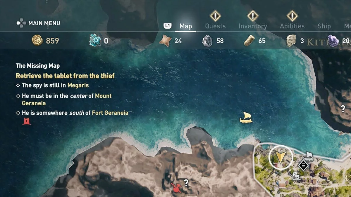 На скриншоте можно увидеть пример подсказок. Вам нужно найти вора, который находится в локации Megaris. Искать нужно место в центре горы, южнее форта.