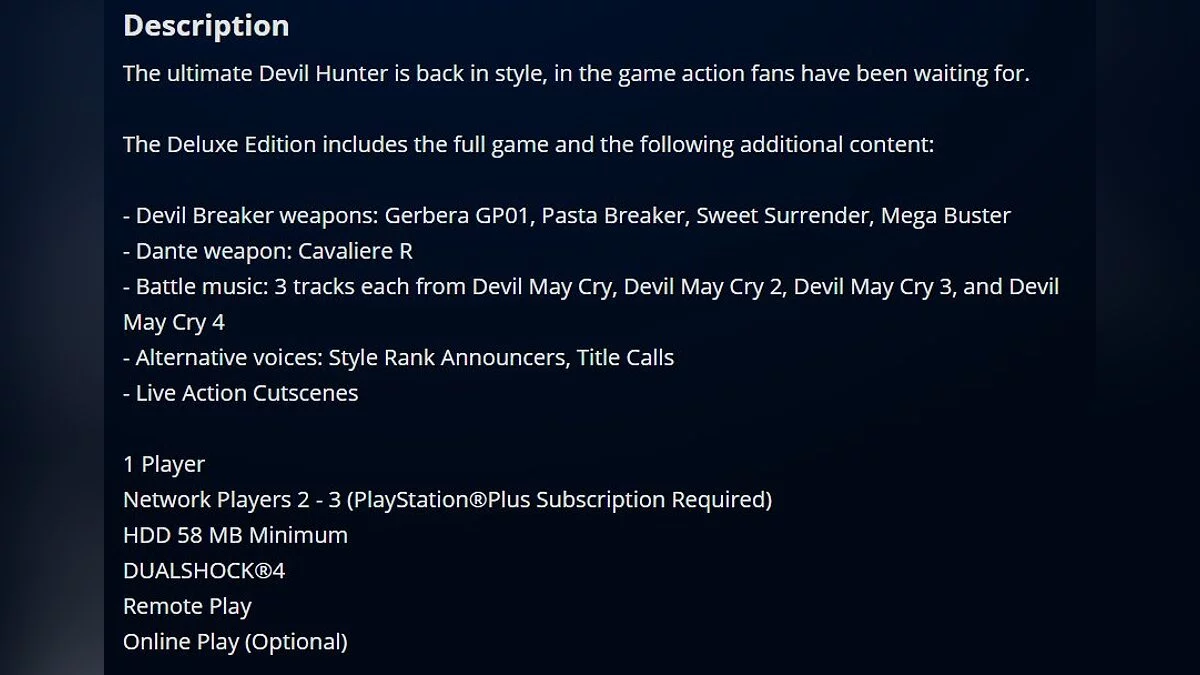 Поскольку в будущем слешере будет три играбельных персонажа, скорее всего, это будет кооперативный режим. Помимо необычного для серии режима, описание раскрыло преимущества Deluxe Edition. Так, в специальное издание войдут дополнительные протезы для Неро, оружие для Данте, по 3 музыкальные композиции из Devil May Cry, Devil May Cry 2, Devil May Cry 3 и Devil May Cry 4, альтернативные голоса и катсцены.