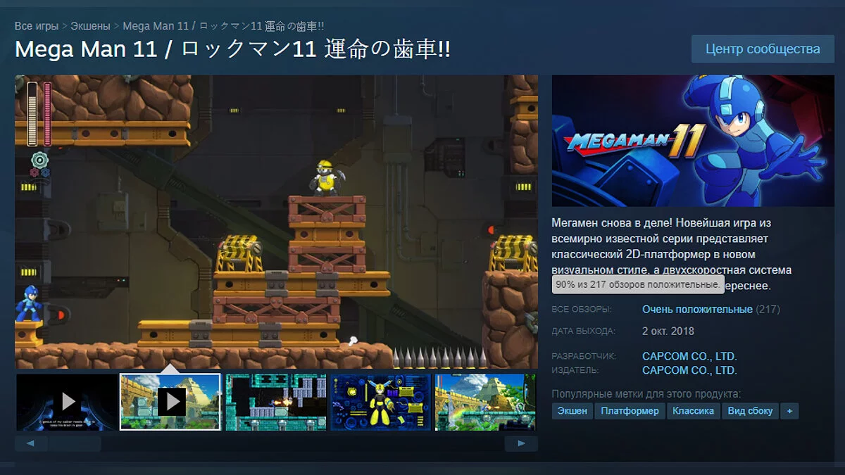 Capcom выпустила для PC, PS4, Xbox One и Nintendo Switch экшен-платформер про синего робота Mega Man 11. Около 90 % геймеров в Steam поставили игре положительные оценки.