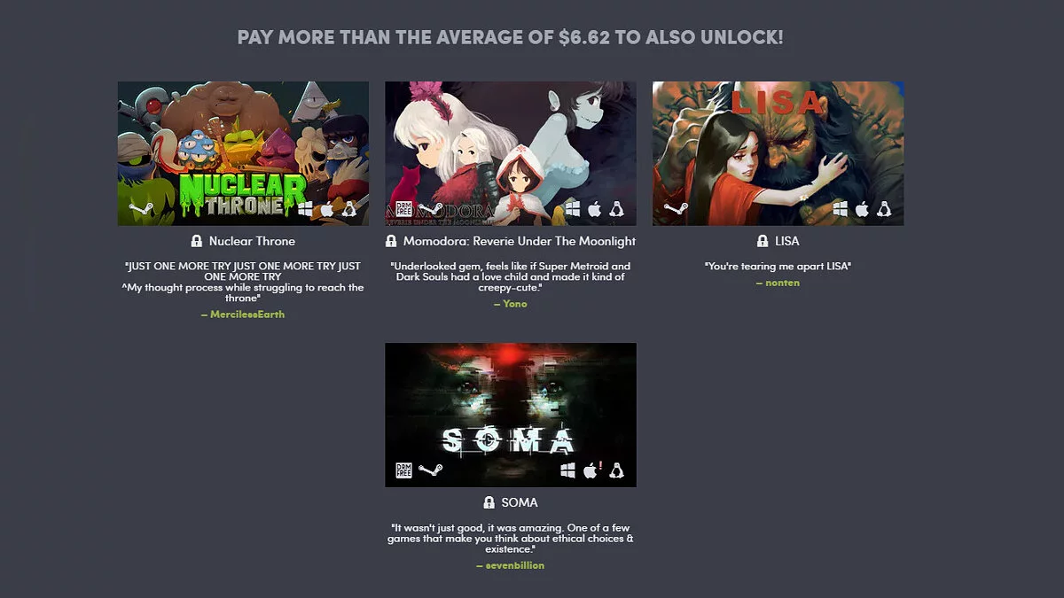 За $6,62 сайт подарит Nuclear Throne, Momodora: Reverie Under The Moonlight, LISA и чудесный хоррор SOMA, а за $15 покупатели получат в придачу Opus Magnum.