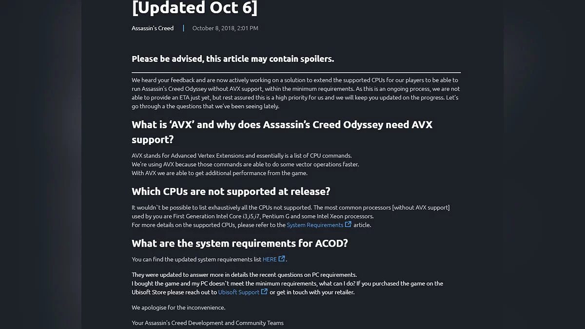 Стоит заметить, что Ubisoft объяснила изменение системных требования желанием улучшить производительность игры, оснастив ее поддержкой всех современных технологий. Проблема в том, что многих, кто предзакал игру, не предупредили об изменении системных требования перед самим релизом.