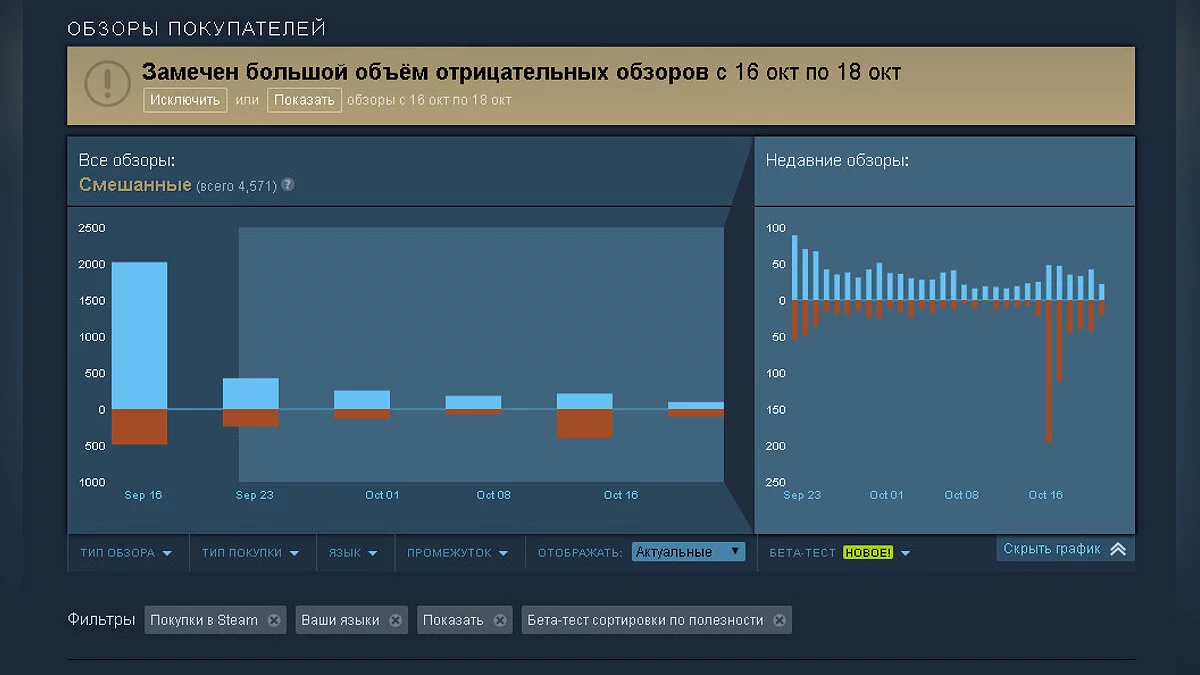 Начиная с 16 октября, на Shadow of the Tomb Raider в Steam начали действовать большие скидки: 34% для стандартного издания и 47% для Croft Edition. Такая акция безумно возмутила тех пользователей, которые купили игру в сентябре. Многим геймерам кажется, что подобное снижение цены спустя месяц после релиза — это ненормально и нечестно. За несколько дней игра собрала более 400 отрицательных отзывов.