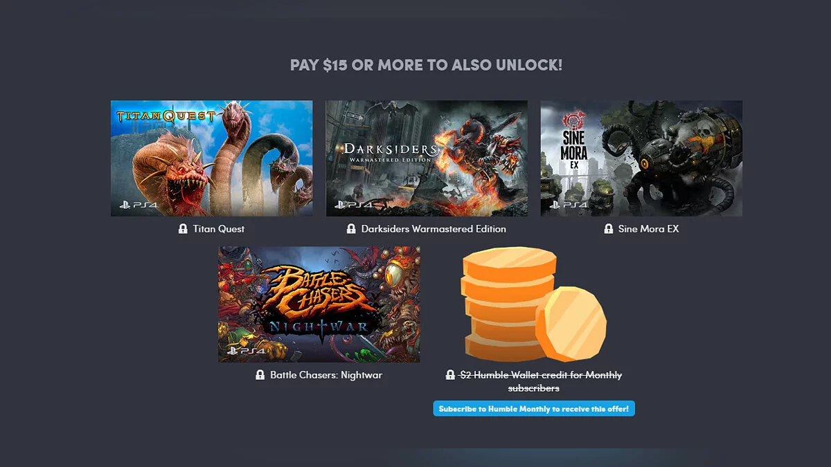 Наконец, за $15 набор пополнится Titan Quest, Darksiders: Warmastered Edition, Sine Mora EX, Battle Chasers: Nightwar и скидкой в $2 на подписку Humble Monthly.