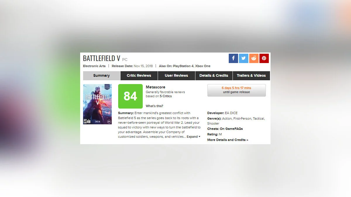 На данный момент средний балл на Metacritic колеблется в районе 84-85 баллов — игра немного не дотянула до Battlefield 1 с 88 баллами.