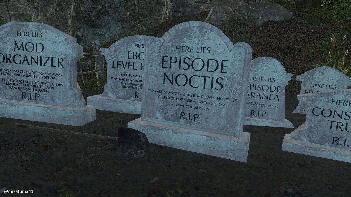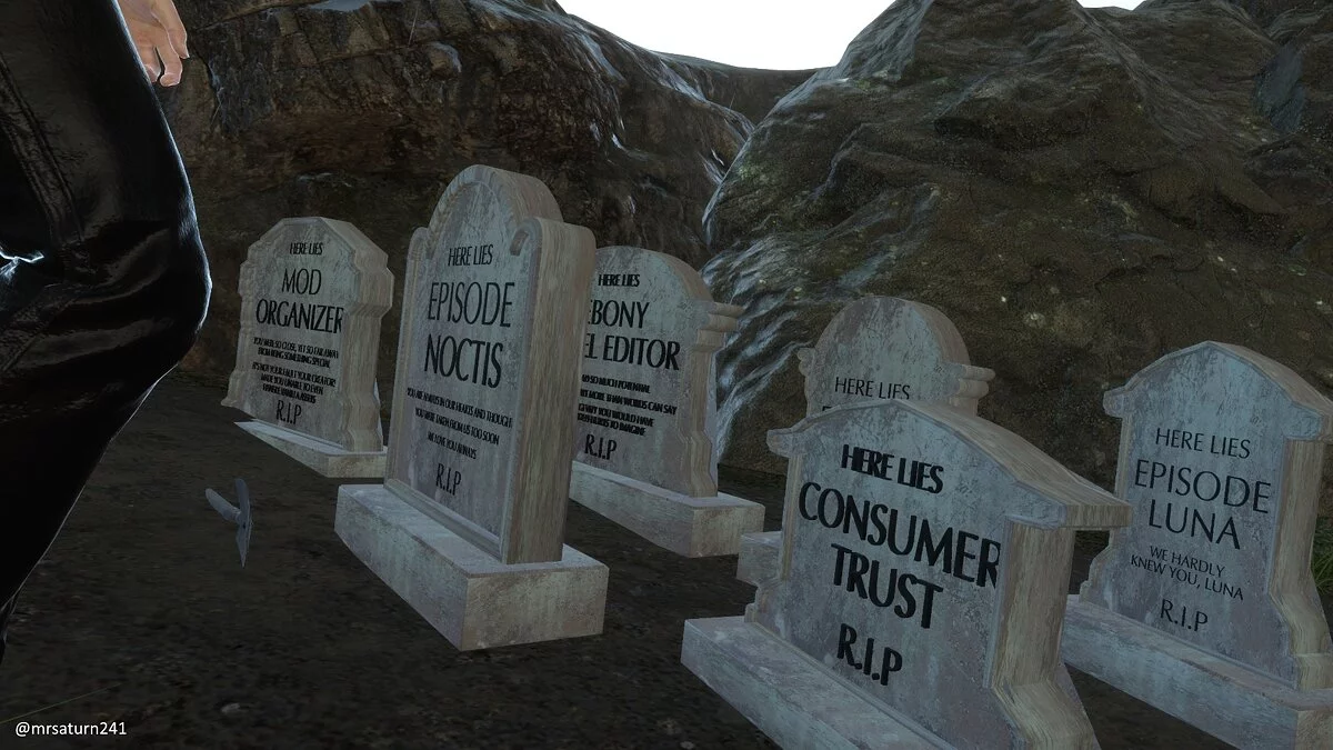 После того, как глава разработки Final Fantasy XV, Хадзиме Табата (Hajime Tabata), объявил о своем уходе из Square Enix, стало известно, что игра не получит обещанные три дополнения про Аранею, Лунафрею и Ноктиса, а также полноценный редактор уровней. В связи с этим, для многих геймеров Final Fantasy XV «умерла», а поэтому некоторые моддеры уже создали модификацию, в которой попрощались с игрой и установили отмененным дополнениям надгробия.