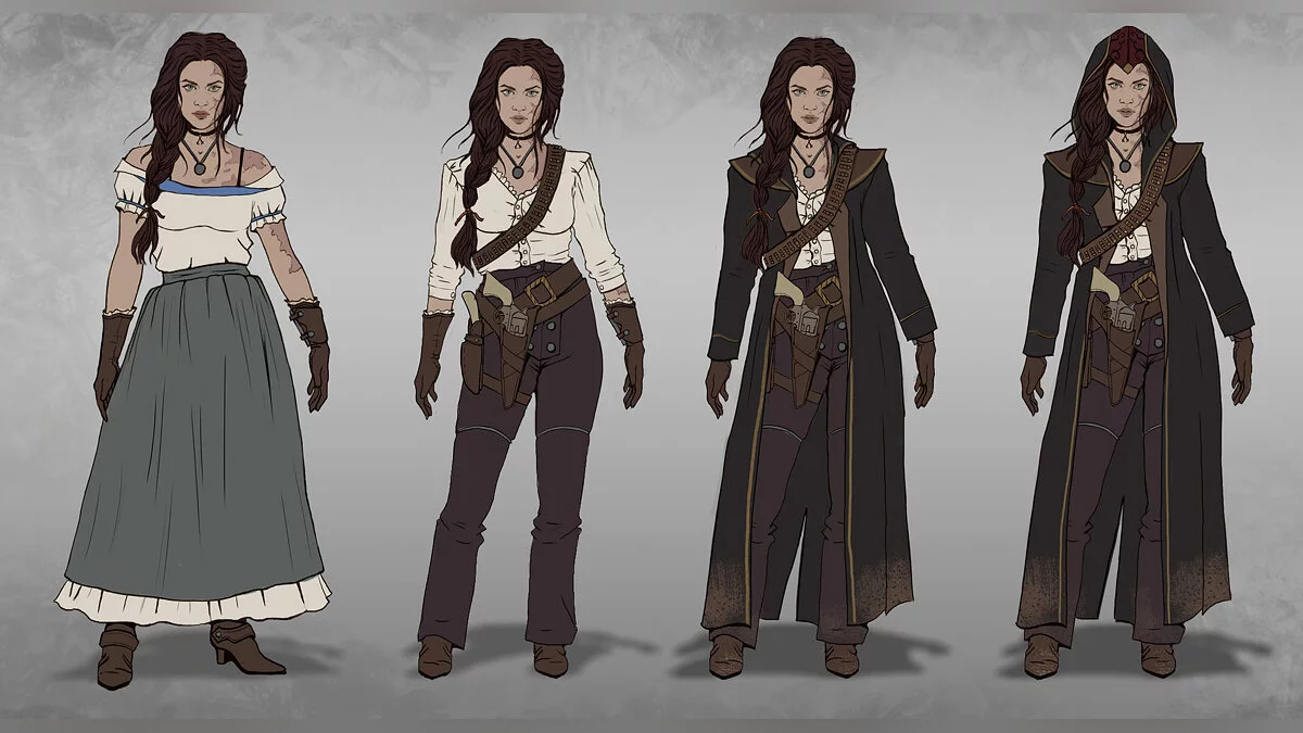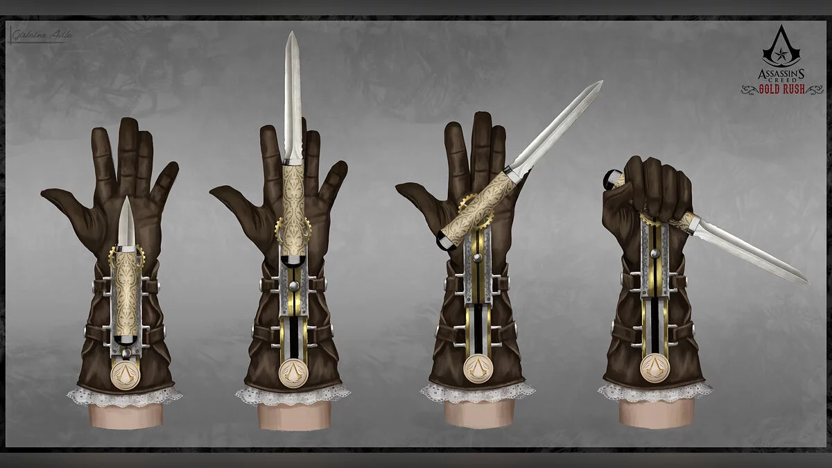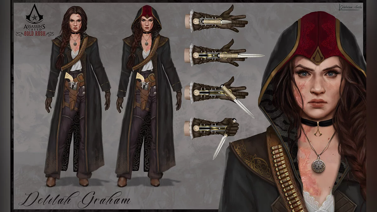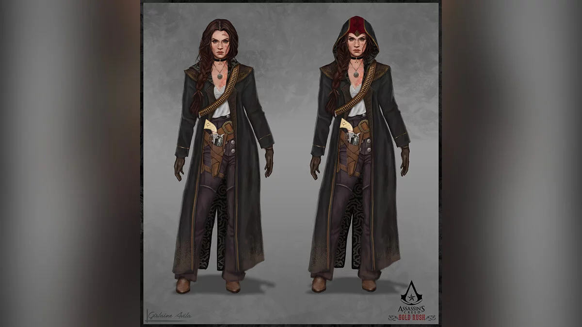 Художница постаралась совместить стилистику ассасинов с образом девушек из вестернов. Героиня вооружена скрытым клинком и револьвером с уникальными гравировками. Как и полагается ассасинам, голову девушки скрывает капюшон с символикой ее ордена.