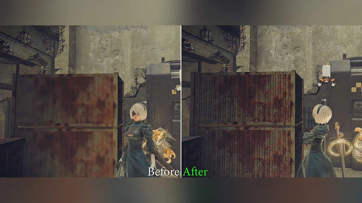 Спустя год после выхода мода HD Texture Pack для NieR: Automata, его создатель GPUnity решил дополнить сборник, добавив более 230-ти новых HD-текстур для окружающего мира (стен, камней, различных строений) и главных героинь — 2B и 2A. Разницу в качестве сложно не заметить, но это еще далеко не финальная версия.