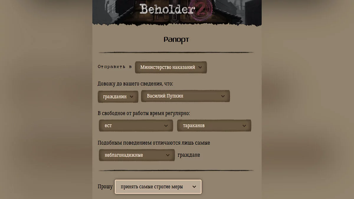 Сегодня в Steam вышла тоталитарная стратегия Beholder 2, которая погрузит вас в антиутопический мир доносов, выслуживаний перед начальством и тотальной слежки. По этому случаю мы запустили специальную форму, в которой вы сможете подать рапорт на своего друга и рассказать о том, чем он занимается в свободное от работы время.