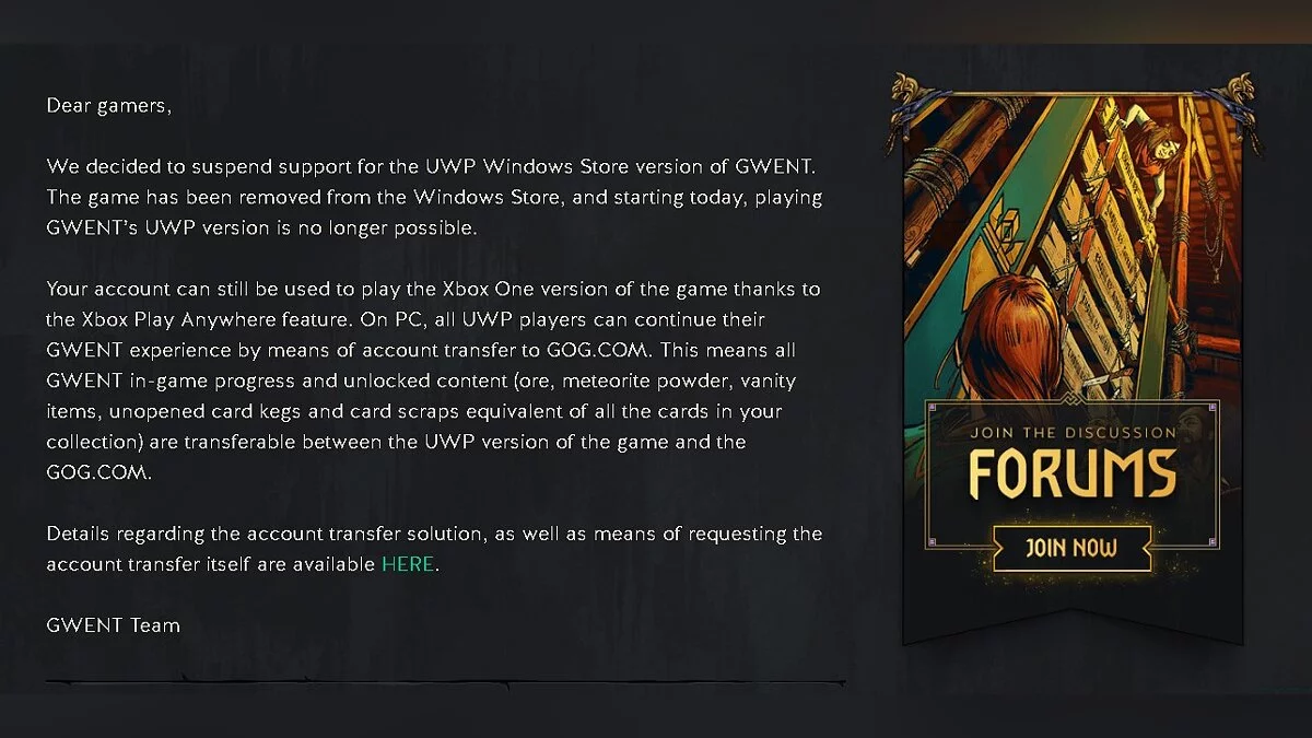 Теперь к серверам «Гвинта» через версию из Microsoft Store подключиться невозможно. Игра вновь стала эксклюзивом для GOG, а всем фанатам предложили перенести свой прогресс на GOG-аккаунт.
