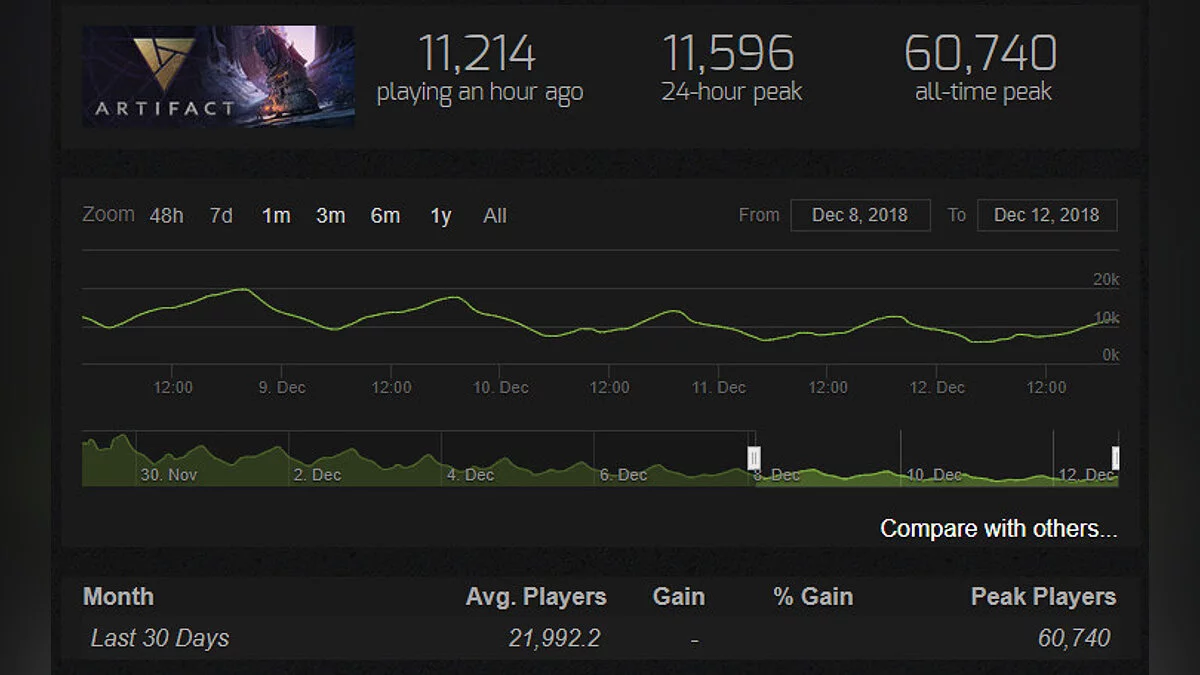 По данным SteamCharts, карточная игра Artifact продолжает терять свою аудиторию. Если неделю назад в игре находилось примерно 30 тысяч человек, то сегодня пик составил всего 11 тысяч.