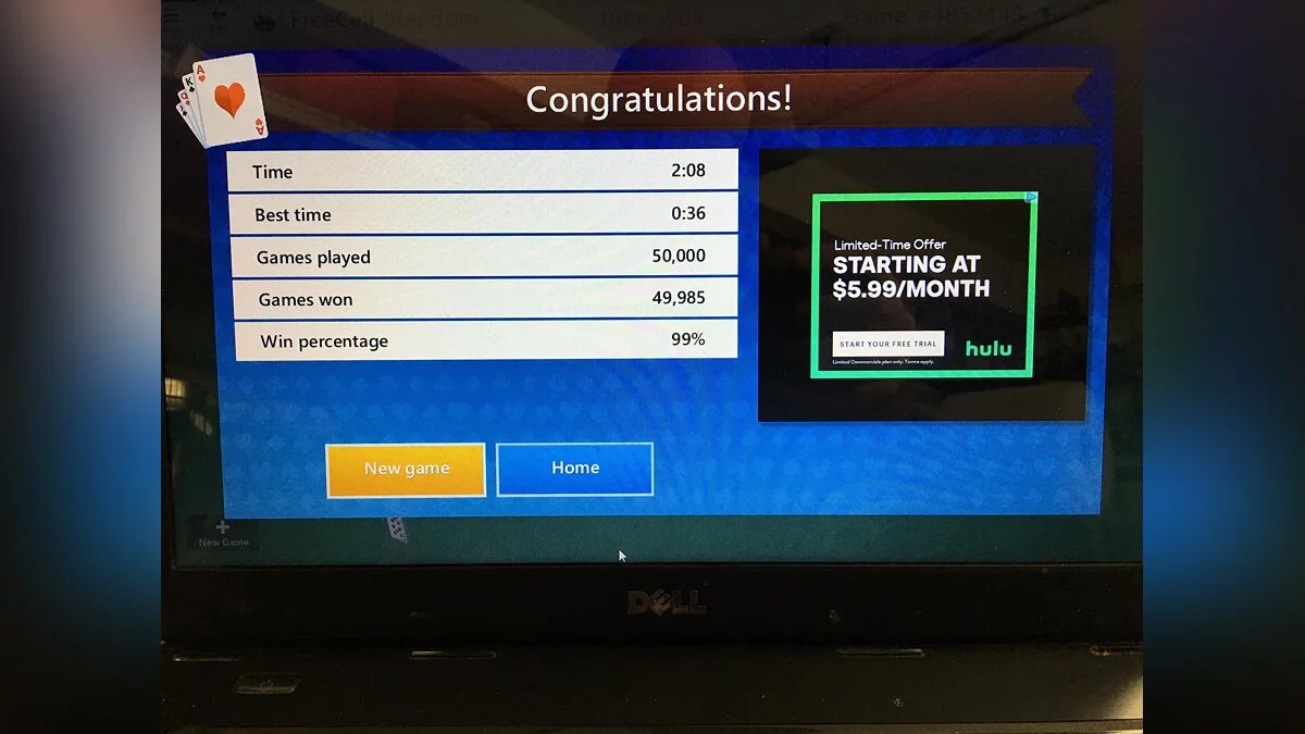 Пользователь Reddit с ником avpogo написал на форуме о своем 72-летнем отце, который добился ошеломительного результата в карточной игре «Пасьянс» (Solitaire) на Windows 10.