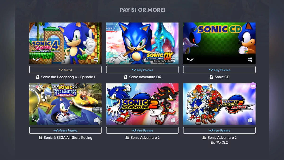 Заплатив всего доллар, покупатели получат сразу 6 игр: Sonic the Hedgehog 4: Episode 1, Sonic Adventure DX, Sonic CD, Sonic & SEGA All-Stars Racing, Sonic Adventure 2 и Sonic Adventure 2: Battle.
