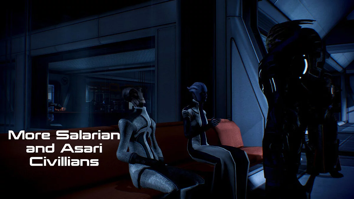 - Полностью изменена наполненность локаций «Цитадели»: теперь чаще встречаются саларианцы, асари, туриане и множество других рас, которые должны были присутствовать на локациях изначально, по ЛОРу;