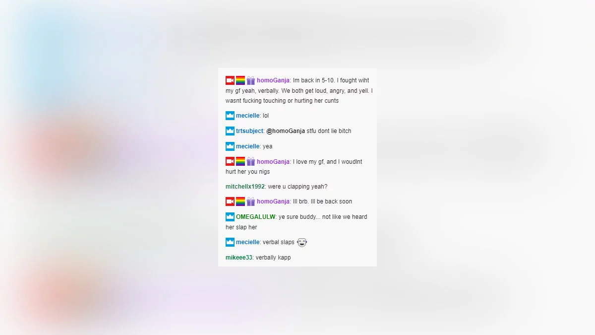 Когда канал HomoGanja забанили, он рассказал о ситуации подробнее: девушка стримера пришла домой и начала разговор в грубой манере, а из-за того, что сам homoGanja уже почти 23 часа вел стрим, он моментально среагировал и начал драку. Естественно, данный факт не оправдывает начатую потасовку. HomoGanja заметил, что он планирует порвать отношения с девушкой.