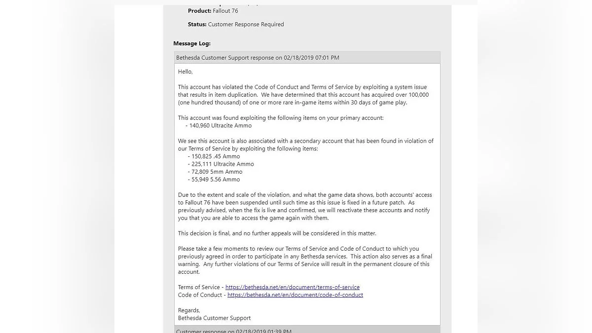 Bethesda отправила игроку письмо, в котором объяснила, что забанила игрока за слишком большое количество предметов в его инвентаре, которые он получил за последние 30 дней (у игрока было свыше 100 000 патронов).