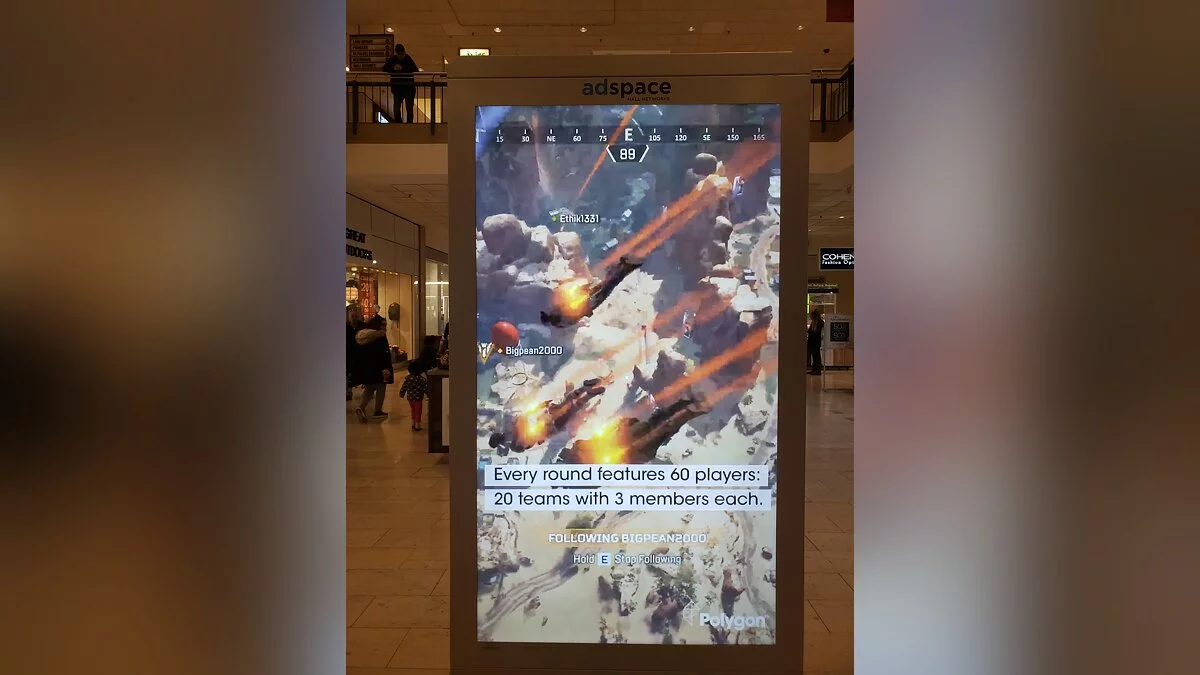 «Королевская битва» Apex Legends от создателей Titanfall становится популярнее, а для поддержания её быстрого «распространения» разработчики решили сделать рекламу не только в интернете, но и в торговых центрах. Вот только ник игрока, случайно показанный в этой рекламе, смутил и рассмешил большинство геймеров, которые его увидели. На охоту вышел... «БольшойЧле2000».