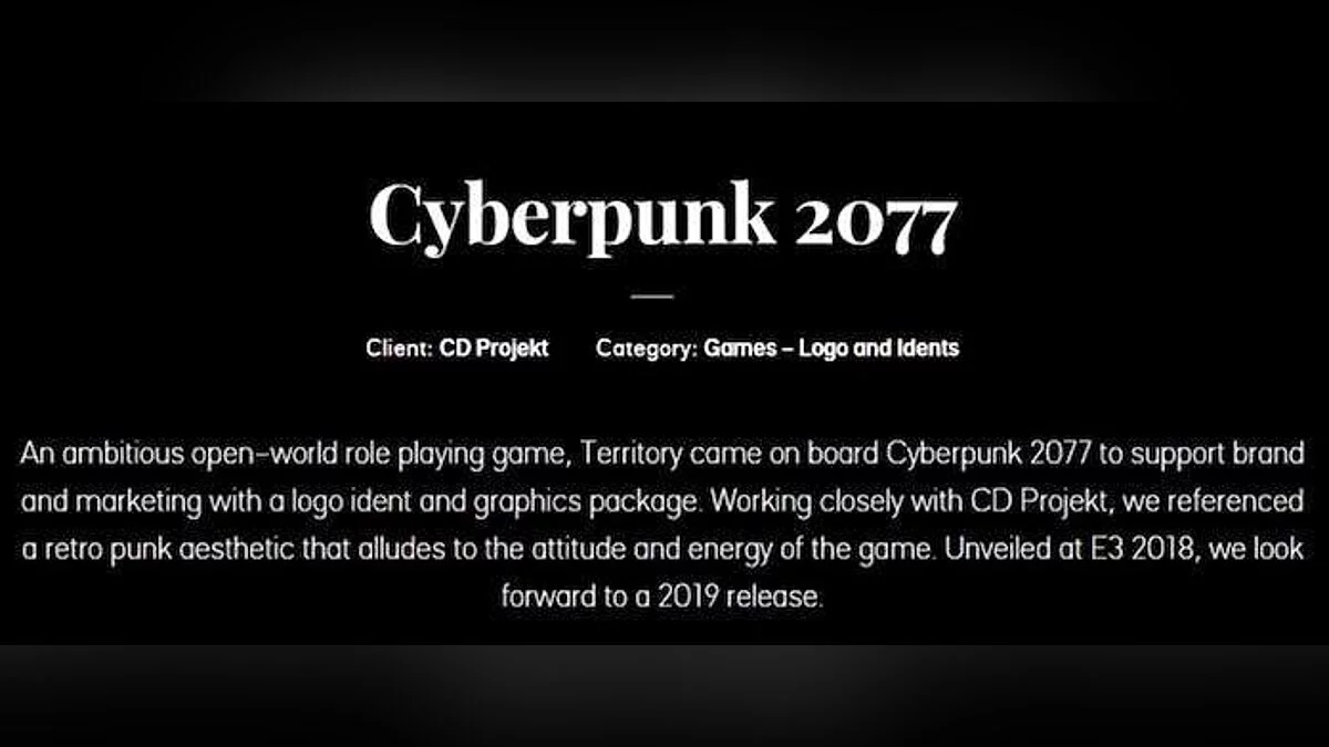 На сайте студии Territory Studio, которая работает над интертитрами для Cyberpunk 2077, случайно всплыл год выхода игры.