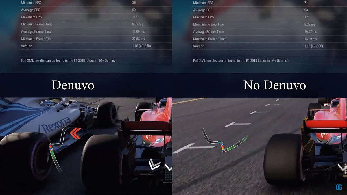 К примеру, в F1 2018 минимальная частота кадров с включенной Denuvo составила 26 FPS, в то время как без этой защиты этот показатель равен 71 FPS.