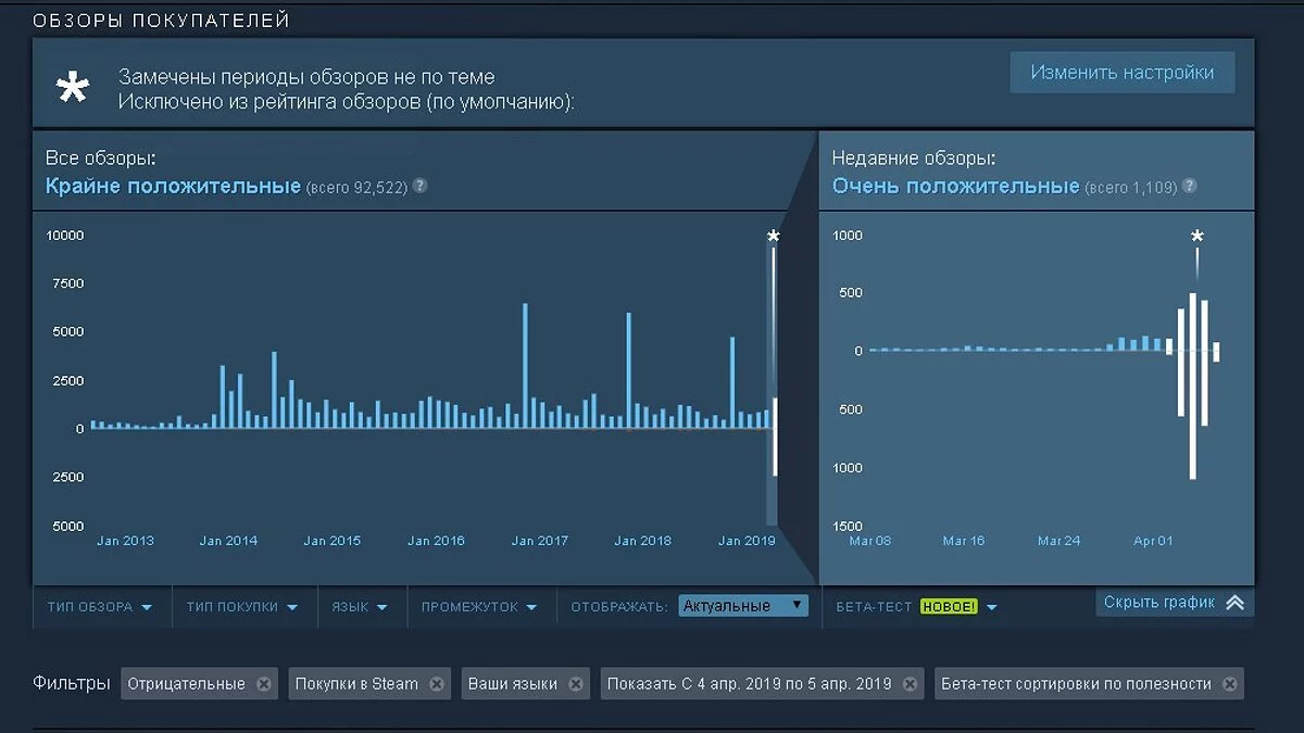Как можно заметить, новая система отреагировала на «аномальное» изменение рейтинга Borderlands 2 и скрыла обзоры игры, написанные с 3 по 6 апреля. Чтобы их прочитать, нужно нажать на звездочку над скрытым рейтингом. Там же можно изменить настройки и сделать так, чтобы скрытые обзоры показывались всегда.