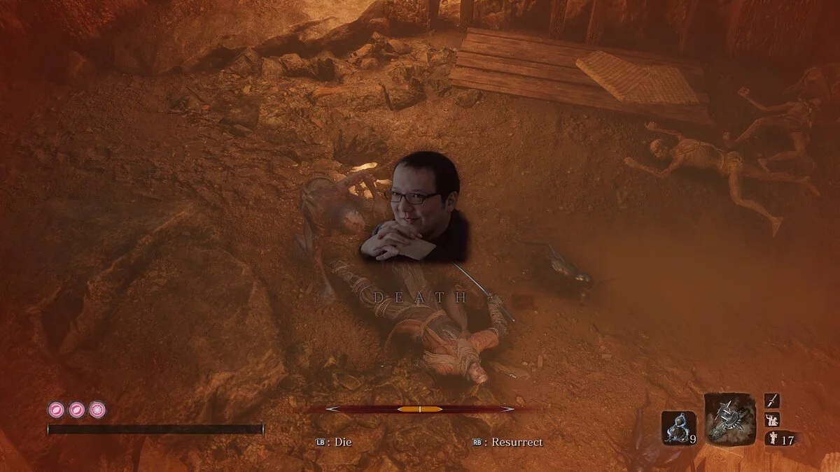 Моддер заменил экран смерти в Sekiro: Shadows Die Twice ухмыляющимся лицом разработчика