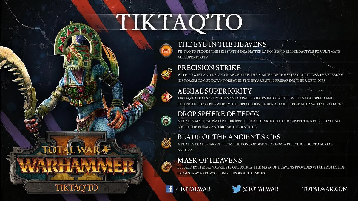 Разработчики Total War: Warhammer 2 опубликовали в своём Twitter информацию о новом легендарном герое. Его зовут Tiktaq’to и он мастер воздушного боя.