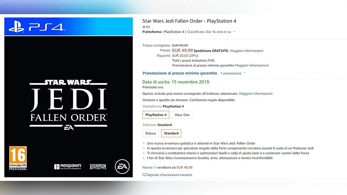 Обновлено. Сетевой магазин Amazon тоже слил дату выхода Star Wars Jedi: Fallen Order, которая точь-в-точь повторяет предыдущую утечку.