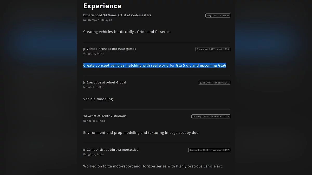 Этот намек нашли в резюме бывшего 3D-художника Rockstar Бибина Майкла (Bibin Michael). Там написано, что он участвовал в создании концептов для GTA 5 и предстоящей GTA 6.
