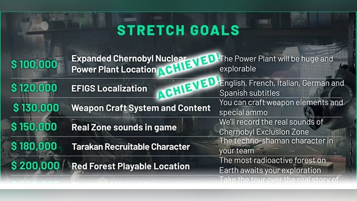 Они посетили это место и отсняли много материалов, чтобы сделать локацию в игре реалистичной. Если в ходе Kicrkstarter-кампании они соберут $200 тыс., в игру добавят дополнительные локации с атомными реакторами, системы крафта и реальные звуки, записанные в ходе пребывания на Чернобыльской АЭС.