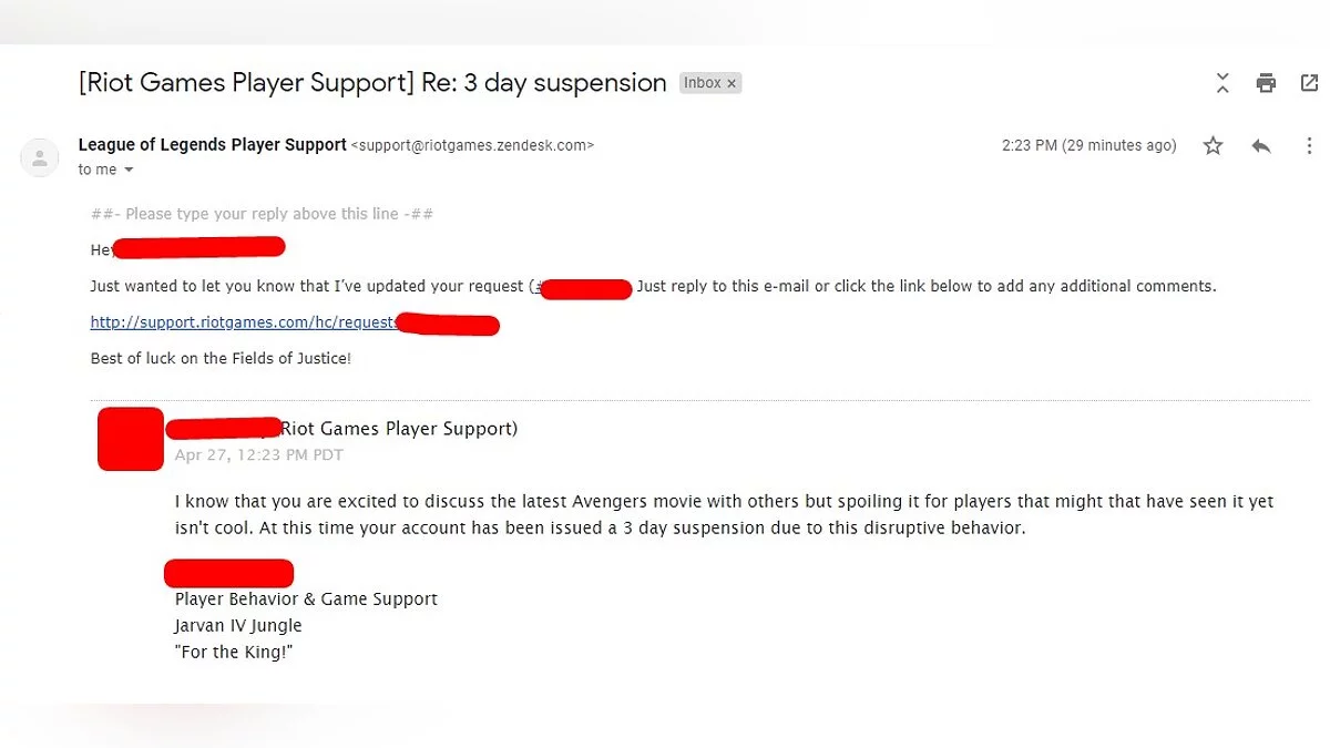 Несмотря на то, что в правилах не прописано ничего про спойлеры к фильмам, случай с «Мстителями» оказался уникальным. Laptop-Guy спрашивал об этом на форуме, но его успокоили и сказали, что максимум за такое могут дать мут. Тем не менее, ответ от поддержки League of Legends говорит об обратном.