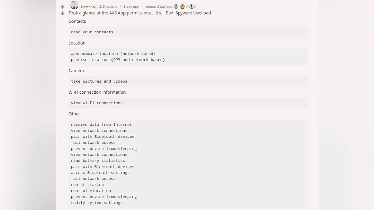 Если верить словам DeathKoil, приложение собирает невероятное количество информации, включая имя и фамилию пользователя, частоту использования AXS, точную информацию о том, на какую рекламу нажимает пользователь, какие покупки были сделаны или не сделаны, IP-адрес, номер кредитной карты, эмейл-адрес, название девайса и его модель, номер телефона и еще много других данных. Именно это и напугало геймеров, которые собрались на BlizzCon.