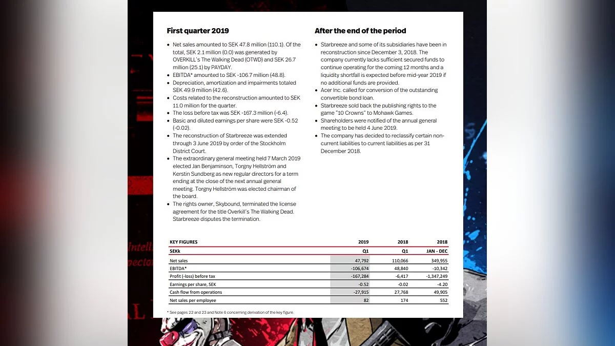 По информации из финансового отчета Starbreeze за 1 квартал 2019 года, компания не сможет продержаться дольше года, если не найдет новые средства. На это повлияли не только неудачные продажи Overkill's The Walking Dead в 2018 году, но и отказ от прав на публикацию некоторых игр, в список которых вошли System Shock 3 и 10 Crowns (эти права были проданы другим компаниям).