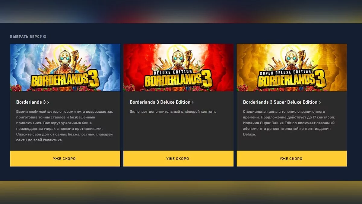 В данный момент оформить предзаказ Borderlands 3 в Epic Games Store невозможно, так как вместо цен с переходом на страницу покупки под изданиями игры появилась заглушка «Уже скоро». Вероятно, 2K Games отказалась от участия в распродаже.