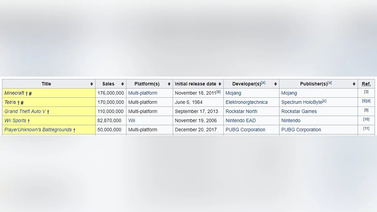 Ниже стоит Grand Theft Auto 5, разработчикам которой удалось продать 110 млн. копий игры, а еще ниже можно найти Wii Sports — известный экслюзив для Wii, разлетевшийся по миру в количестве 82 млн. копий.