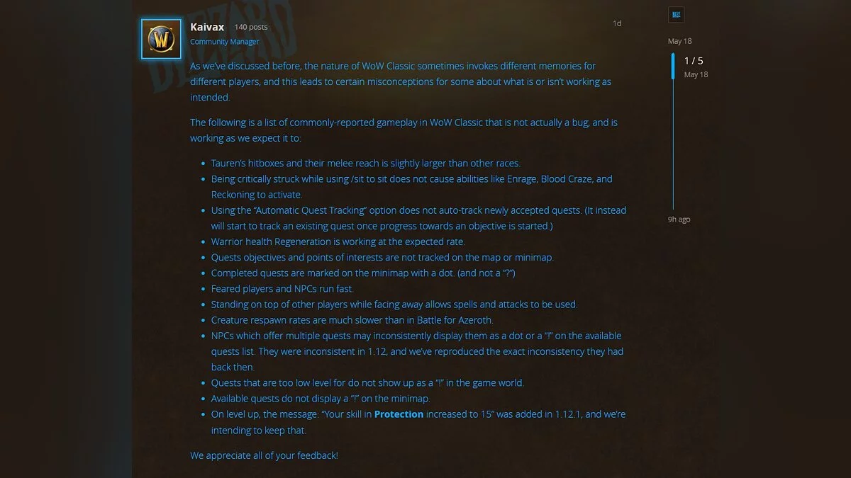 По каким причинам разработчики WoW Classic решили создать эту тему именно сейчас — неизвестно. Вероятно, многие игроки в своих багрепортах присылают информацию о багах, которые на самом деле багами не являются: