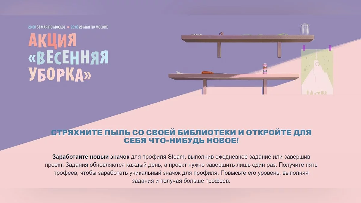В Steam стартовала необычная акция «Весенняя уборка», которая будет дарить значки и предметы пользователям, которые запустят случайные игры из своей библиотеки. Продлится она до 28 мая.