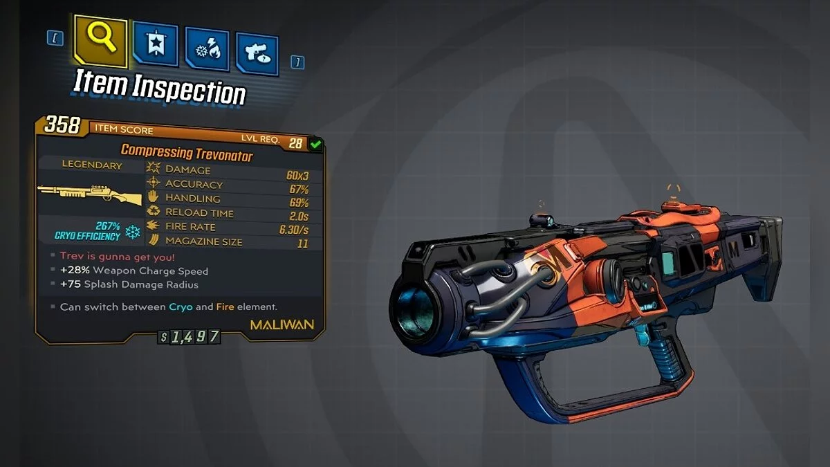 Но разработчики из Gearbox пошли дальше, предоставив Истману возможность самим назвать оружие и придумать к нему описание. Так на свет появился Compressive Trevonator — уникальный дробовик с +28% к скорости заряда и +75 стихийного урона (Крио или Огонь) по площади. Описание довольно простое: «Трев поймает тебя!».