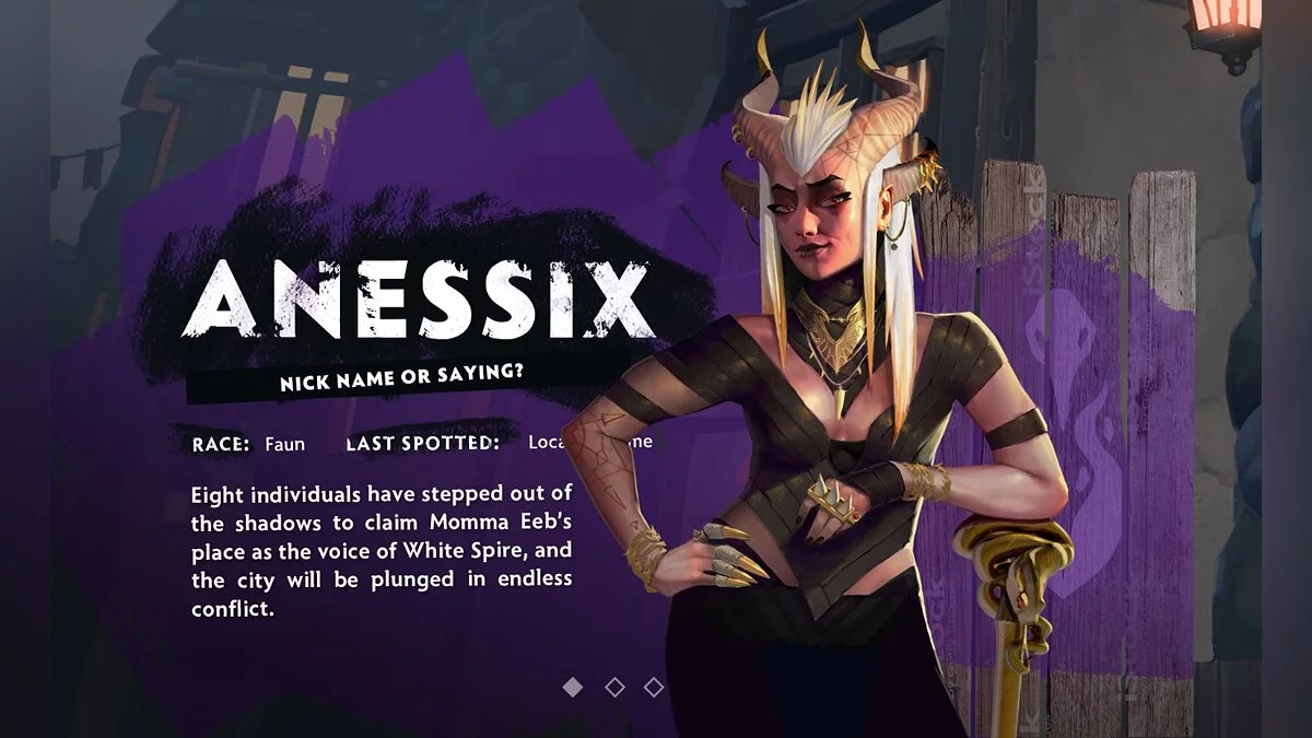Во-первых, в Dota Underlords появится уникальная история. События будут происходить в городе «Белый Шпиль», а трех главных персонажей уже можно увидеть в начале странице. Вот арт для девушки-фавна по имени Анессикс:
