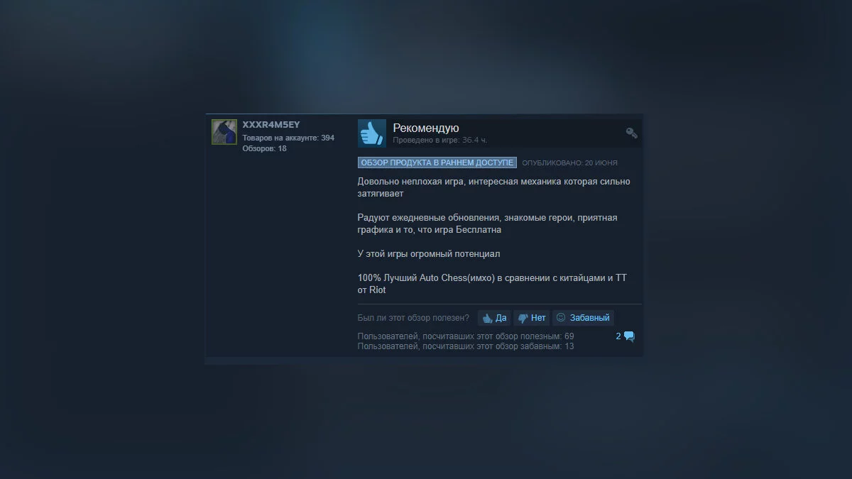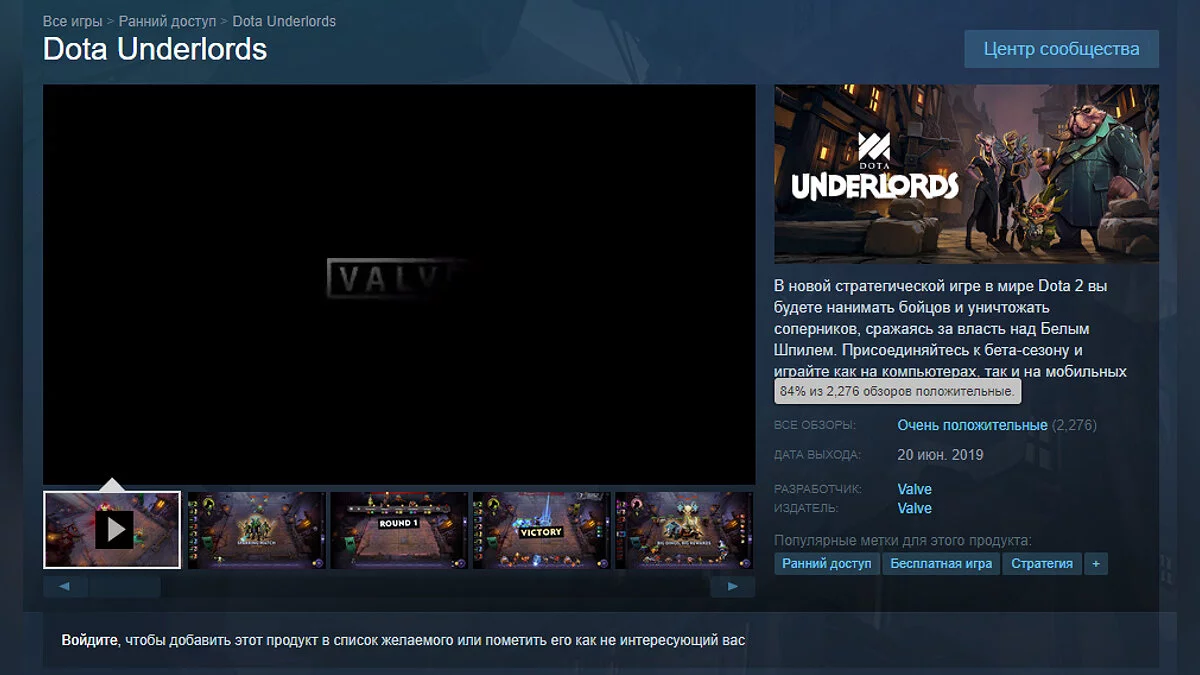 Valve выпустила в раннем доступе Steam стратегическую игру, базирующуюся на шахматной механике, Dota Underlords, которая до этого была доступна только владельцам боевого пропуска к Dota 2. На момент написания новости у игры уже свыше 80% положительных отзывов.