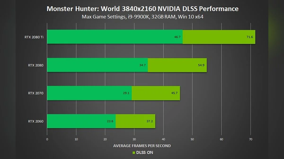 По словам компании, в среднем DLSS позволяет повысить частоту кадров в Monster Hunter: World на 50%. На скриншоте она показала точное количество FPS, которое выдала игра на видеокартах RTX 2060, RTX 2070, RTX 2080 и RTX 2080 Ti.