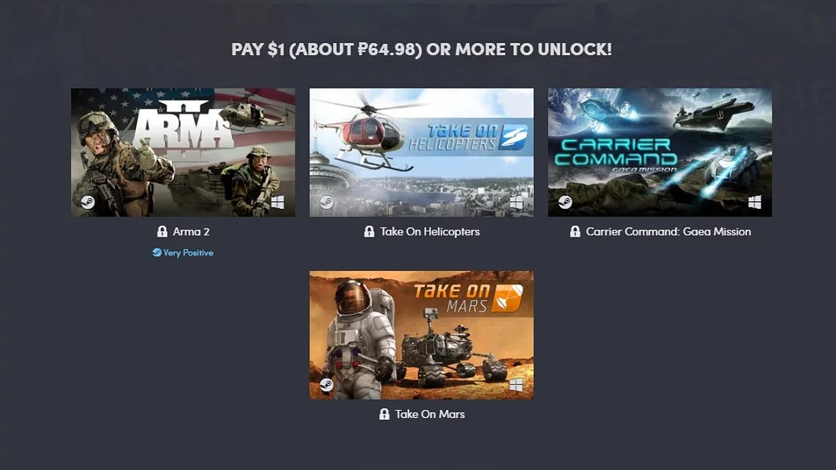 Заплатив всего доллар, покупатель получит сразу четыре игры: ArmA 2, Take On Helicopters, Carrier Command: Gaea Mission, Take On Mars.