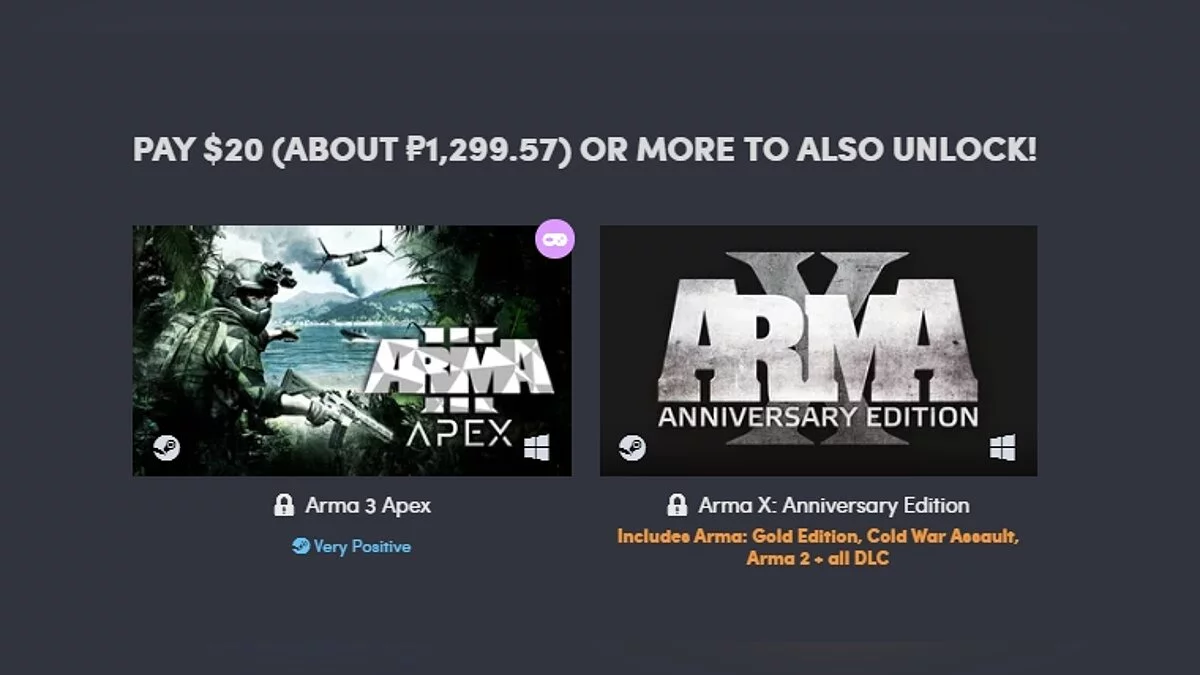 За $20 (примерно 1300 рублей), магазин отдаст Arma 3 Apex и Arma X: Anniversary Edition (туда входит ARMA: Gold Edition, ARMA: Cold War Assault и ArmA 2 со всеми дополнениями).