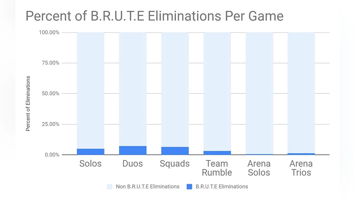 Также Epic утверждает, что с выходом обновления слабые игроки стали совершать больше убийств, в то время как количество убийств от опытных игроков «оставалось стабильным». В ответ на многочисленные просьбы удалить роботов компания опубликовала диаграмму, на которой видно, что процент убийств при помощи мехов (показан синим) не такой уж и большой.