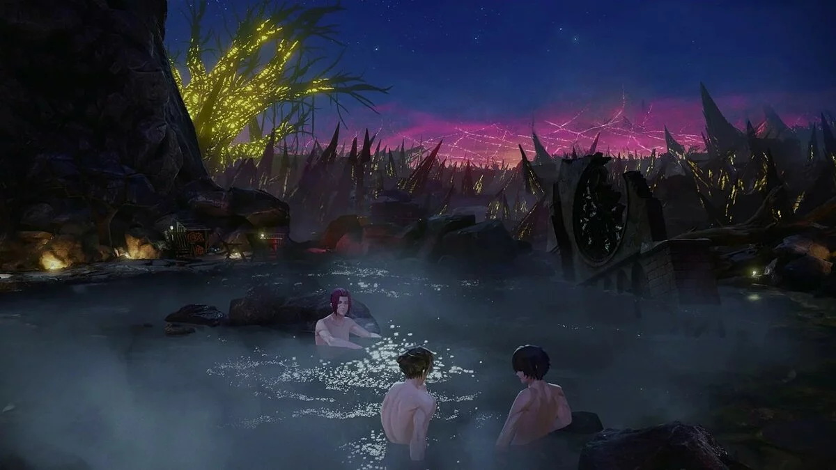 В сети появились новые скриншоты экшен-RPG Code Vein, на которых показали горячие источники и отдыхающих там персонажей.