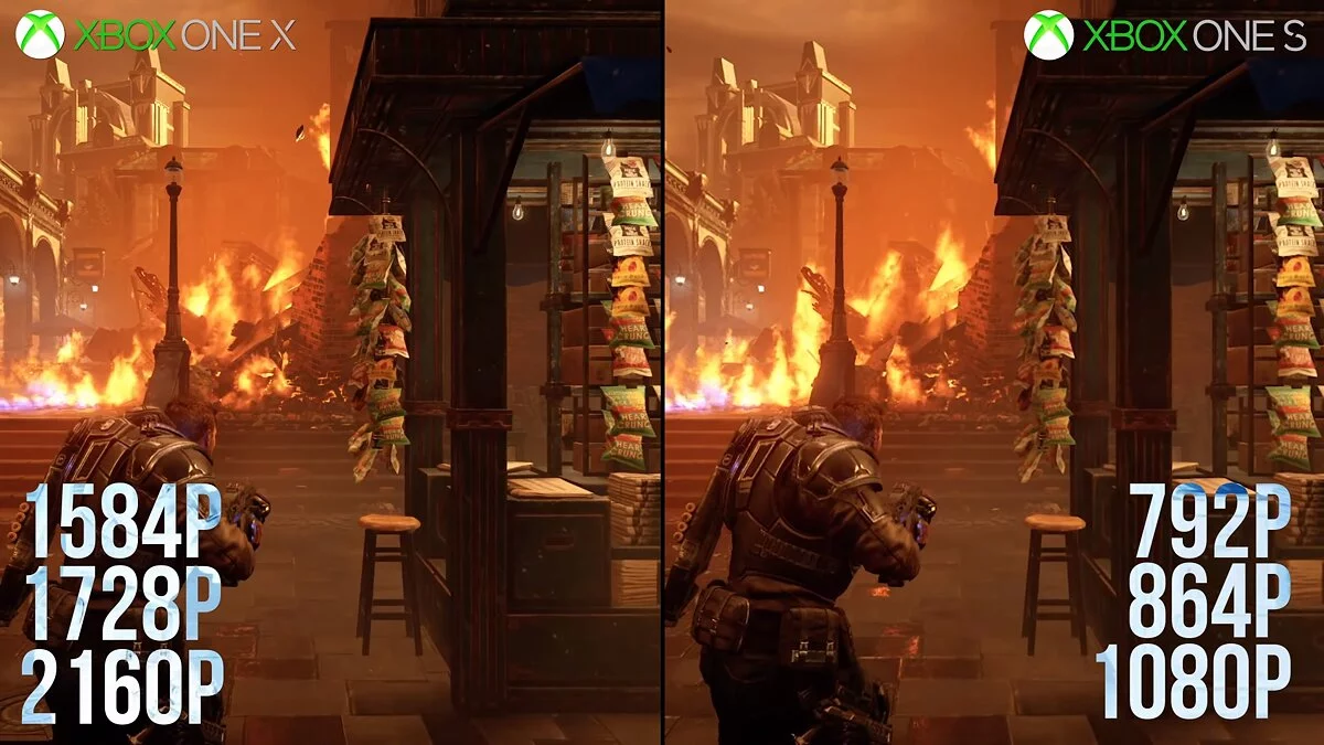 Обе консольные версии Gears 5 используют динамическое разрешение: обычная Xbox One работает в диапазоне от от 792p до 1080p, а Xbox One X — от 1584p до 4К. При этом игра изменяет качество глубины резкости и геометрии объектов, но постэффекты и интерфейс всегда рендерятся в максимальном разрешении — по словам Линнермана, это позволяет добиться более чистой картинки.